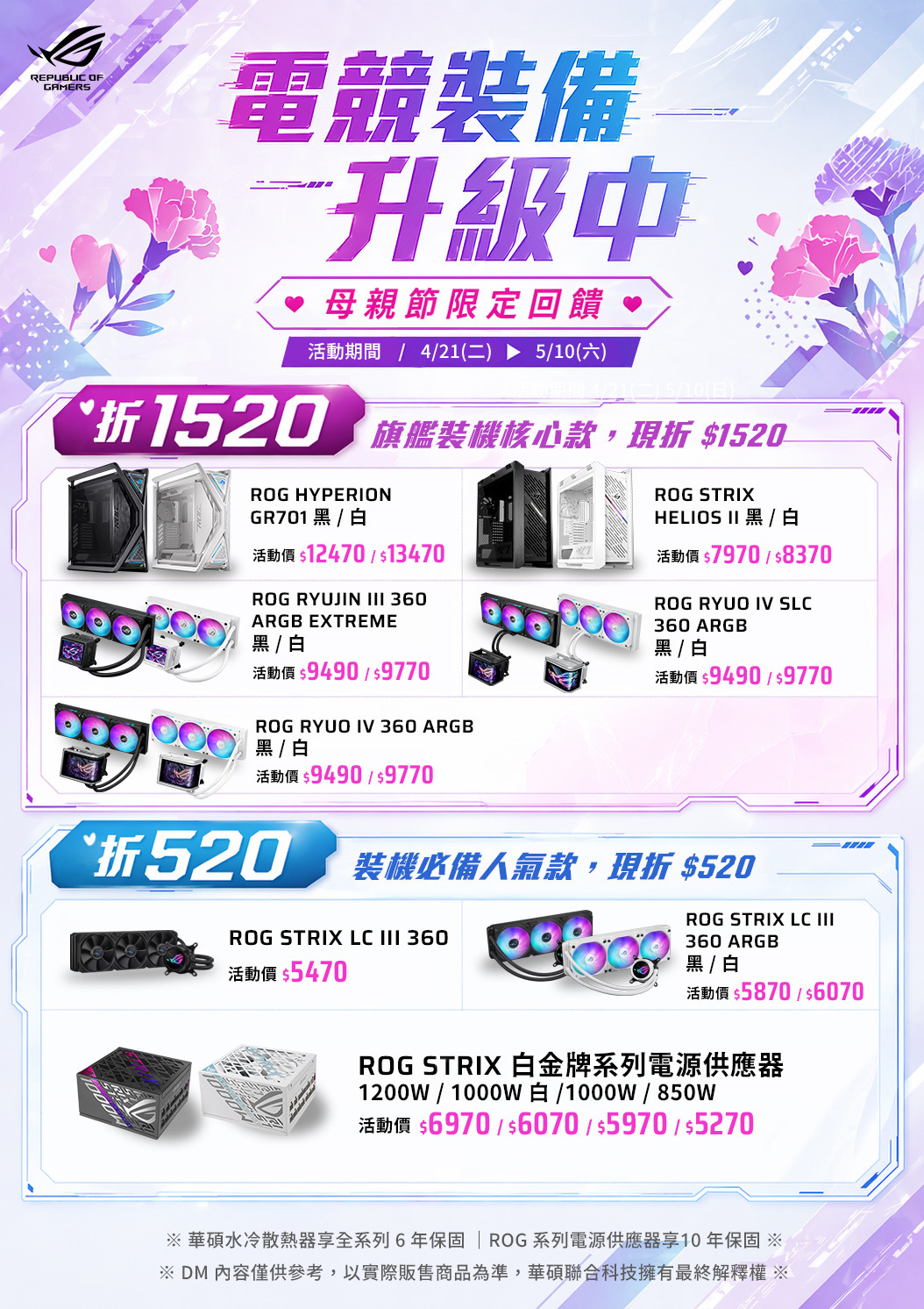 各位玩家久等了!誰說母親節只能送花送禮?對於追求極致效能的硬體玩家來說,這正是「裝備升級」的最佳時機。從 4/21 到 5/10,我們特別推出母親節限定回饋,針對 ROG 玩家共和國 多款旗艦機殼、水冷與電源供應器進行有感降價。