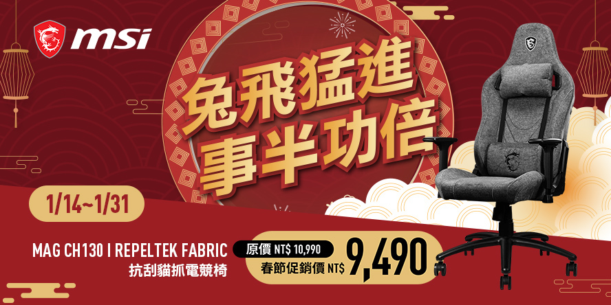 1/14 ~ 1/31 MAG CH130 I REPELETEK FABRIC 抗刮貓抓電競椅,原價$10,990,春節促銷價$9,490。