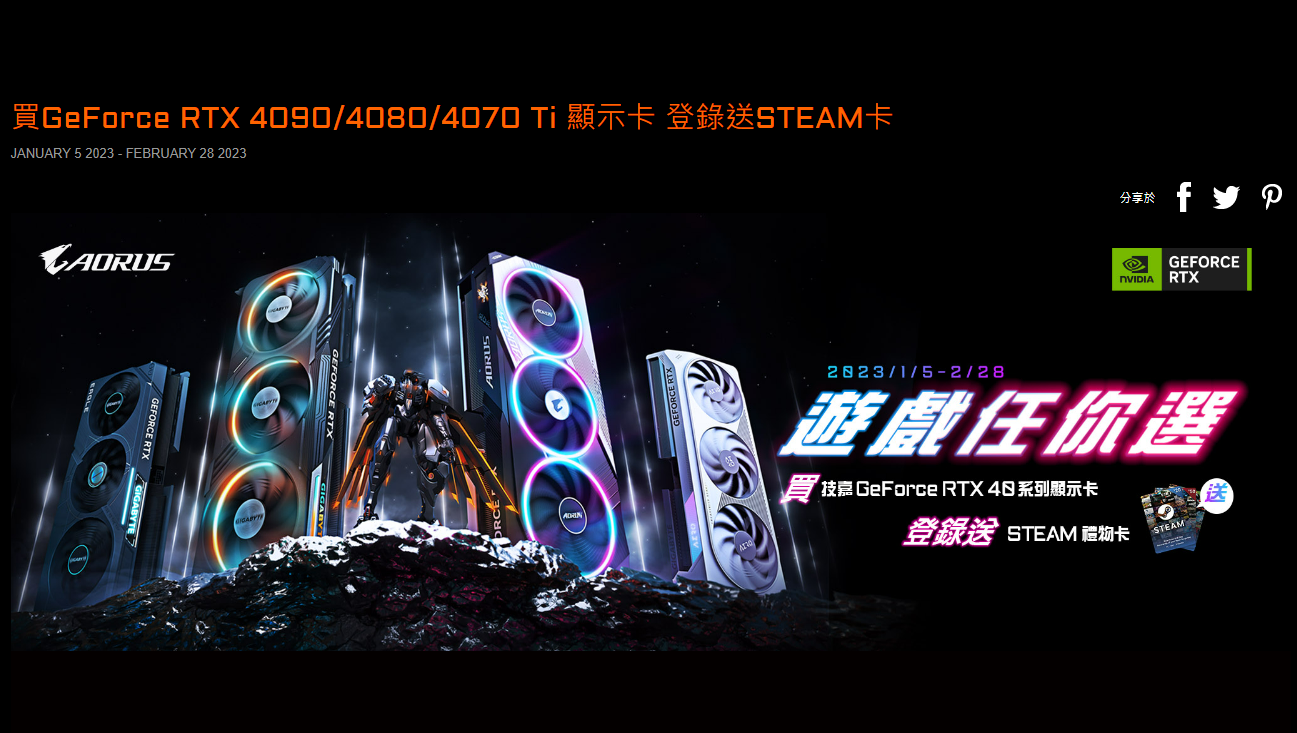 凡於活動期間(2023/1/5~2/28)購買GeForce RTX 4090/4080/4070 Ti系列顯示卡,限量登錄送【STEAM卡770元】序號一組。(數量有限,送完為止)