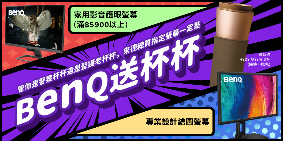 凡於活動期間(2023/1/20~2/20)至德總電腦官網購買BENQ家用系列(滿$5900)or繪圖系列,就送HYDY保溫杯一個(市價$1390)。(數量有限,送完為止)