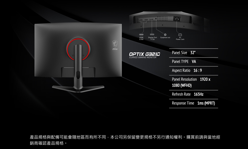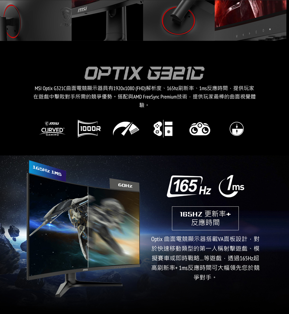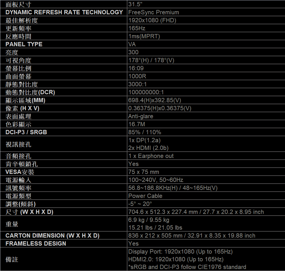 31.5" FHD/1000R/165Hz/1ms/附DP線